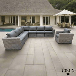 - Champagne Outdoor Patio Wicker L-Shaped Sectional Sofa in Grey with Sunbrella Cushions - Available in 2 Colours