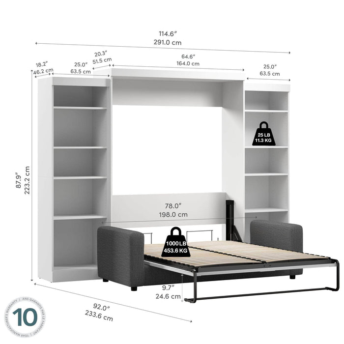 The Bestar Pur Queen Murphy Bed with Sofa and Shelving Units (115W) is the perfect solution for a multipurpose room. This bundle offers you a place to sleep and to sit, as well as storage space for your belongings. The bed accommodates most standard Queen mattresses. The dual-mount wall bed mechanism attaches to the floor and wall for maximum stability and durability.