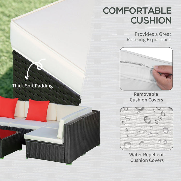 Brighten your patio area with Outsunny's 7-Piece Cushioned Outdoor Rattan Wicker Sofa Set. This high-quality rattan sofa furniture in stylish design is the affordable alternative to your couch or chair. Finest Galvanized steel frame and PE wicker. Washable cushion cover is assembled with zipper. Tea table has tempered glass on its surface. Our 7 Piece furniture set creates an inviting setting you will want to use year after year!